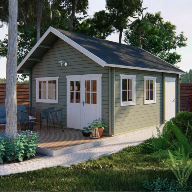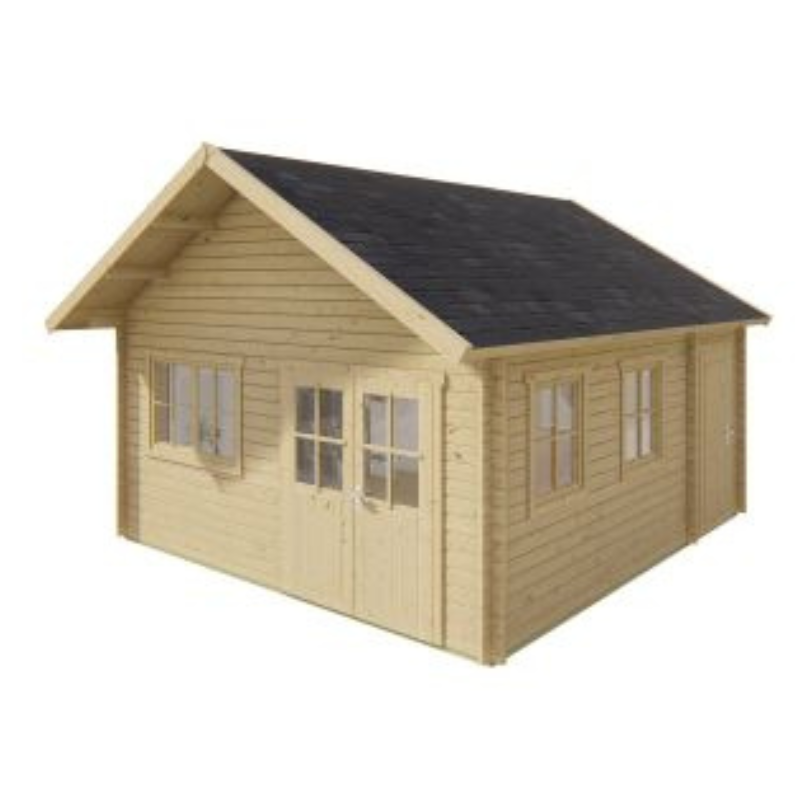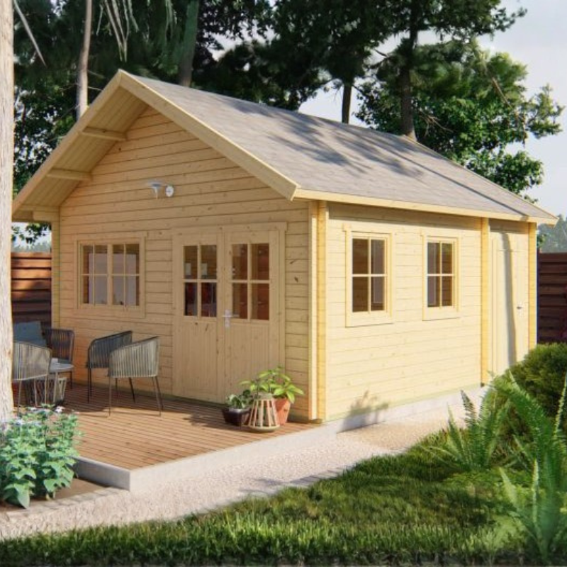 Deze blokhut met overkapping is gemaakt van onbehandeld geschaafd vuren en kun je middels de opties hieronder naar eigen wens samenstellen.