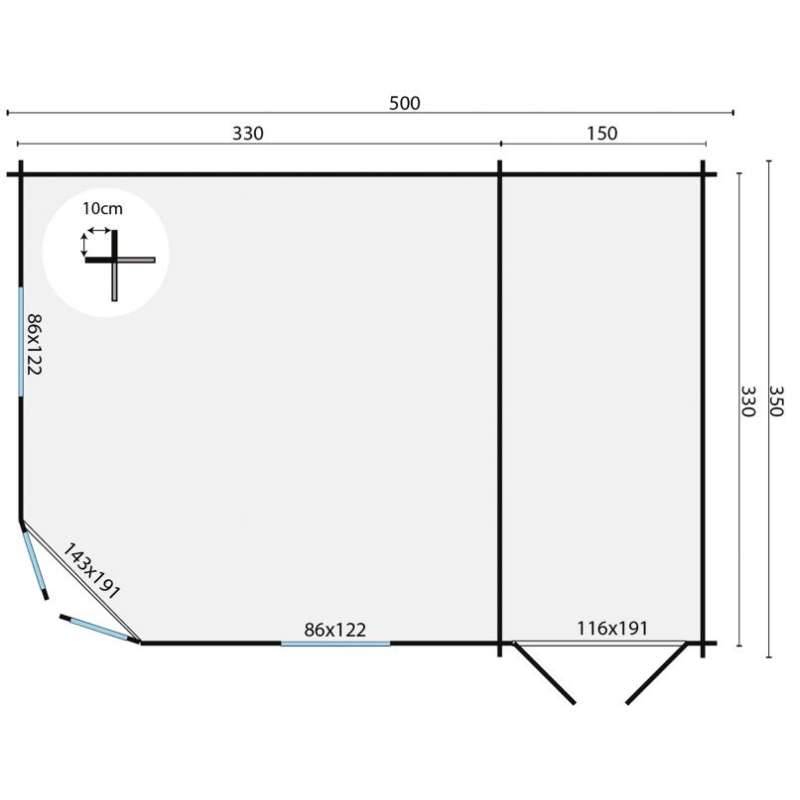Deze blokhut in een hoekmodel heeft een buitenmaat van 350+150x350cm. Deze is gemaakt van onbehandeld geschaafd vurenhout van 44mm dik. De blokhut wordt standaard geleverd inclusief bouwbeschrijving zodat je deze zelf gemakkelijk kunt opbouwen thuis in de achtertuin. Blokhut Helge in een hoekmodel wordt geleverd met losse roedes voor ramen en deuren.